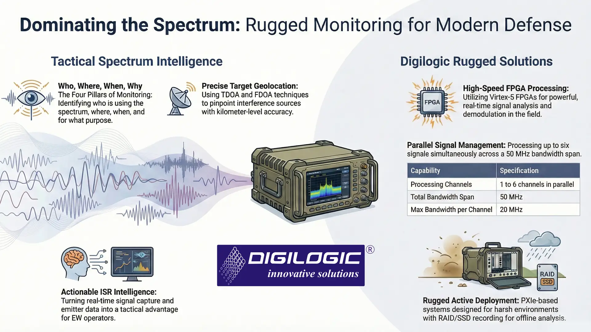 Spectrum monitoring systems must balance laboratory-grade precision with field-ready resilience. Digilogic Systems engineering approach emphasizes modular and scalable designs built on PXI or standalone platforms, offering flexibility to adapt across deployment contexts.